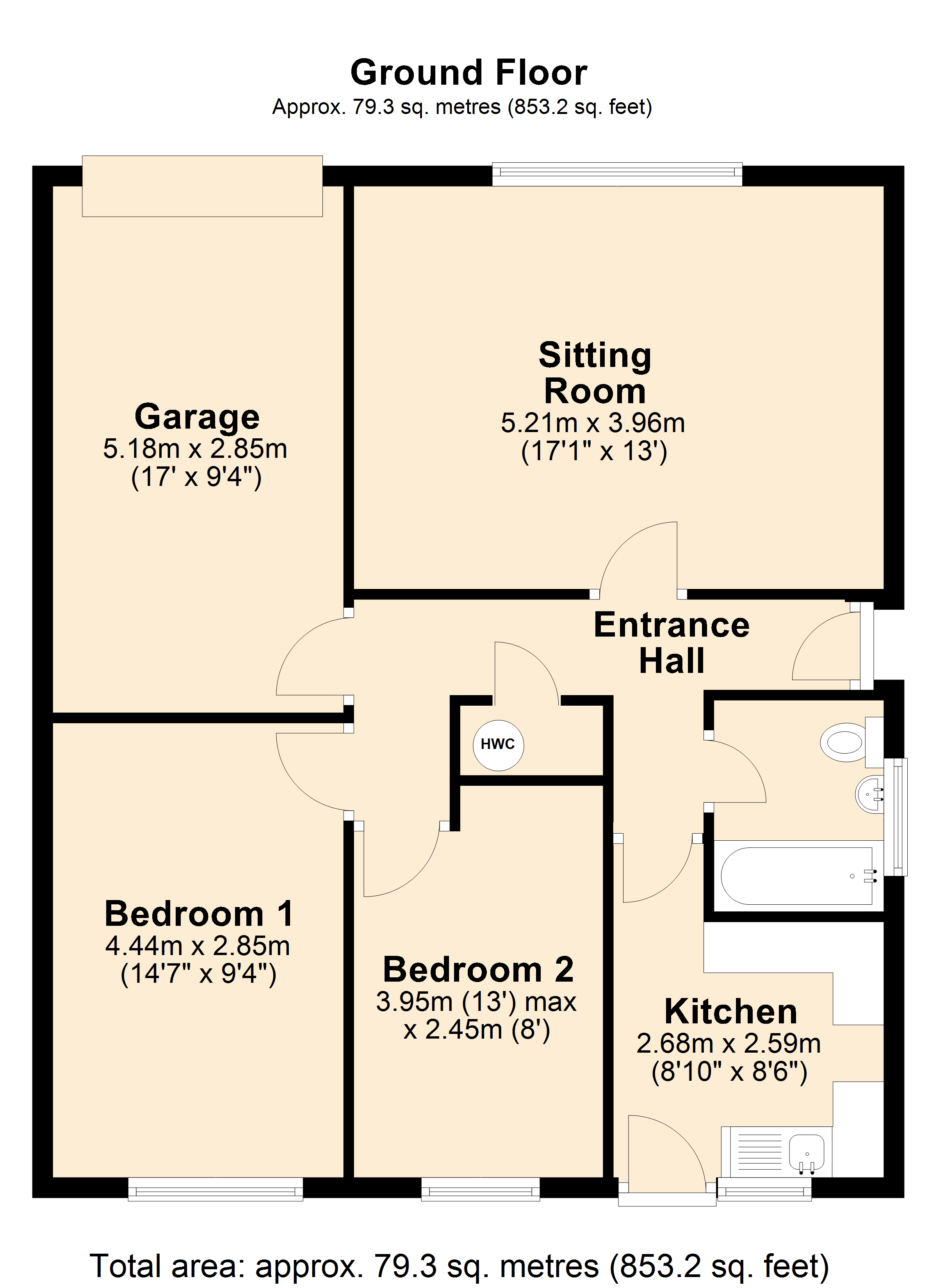 The front door opens into a generous hallway with convenient access to the integral garage. To the right, a bright and generously sized sitting room features a large bow window that floods the space with natural light. Both bedrooms are well-proportioned and benefit from double-glazed windows overlooking the rear garden. The kitchen, also located at the rear, includes a door opening to the garden, and the layout is completed by a family bathroom.