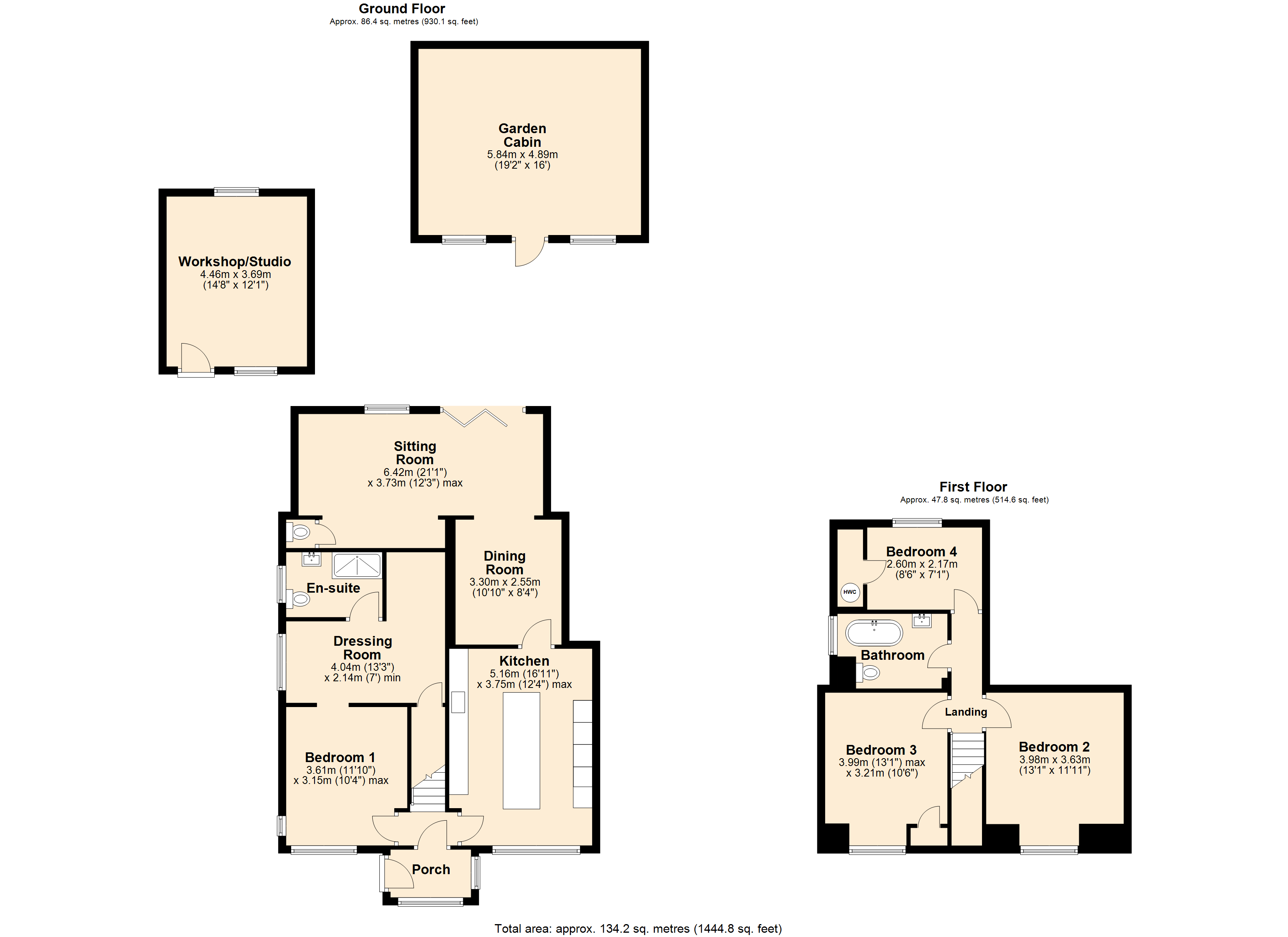 Beyond the seating area, a large expanse of lawn leads to a wildlife corner and substantial timber cabin (19`2” x 16`), fully lined and equipped with light and power, perfect for use as a home office, gym, or creative space.