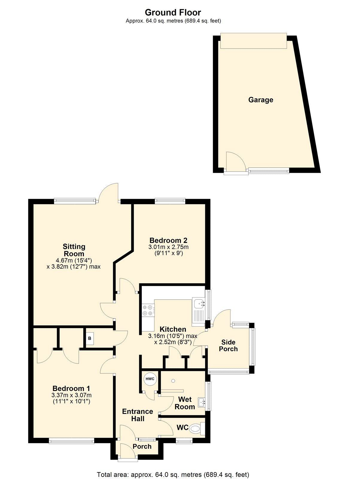 Both bedrooms are generously proportioned, with the principal bedroom benefitting from two built-in wardrobes. The accommodation is completed by a wet room, a separate WC, and a practical side porch accessed from the kitchen.