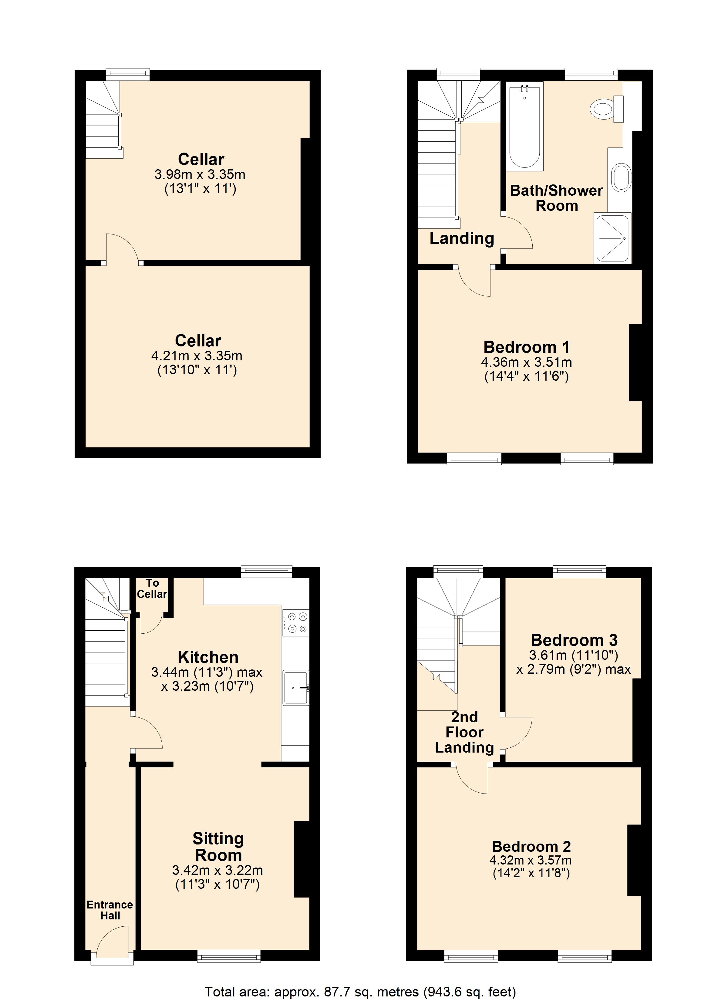 The property enjoys spacious and versatile living accommodation arranged over three floors. On the ground floor you will find a lovely sitting room which has been tastefully decorated and features an ornate cast iron fireplace as its centrepiece. An opening leads through to a stylish modern kitchen fitted with an excellent range of units including a resin work surface with drainer grooves and integrated dishwasher and oven. A door from the kitchen leads down to a spacious two room cellar with a number of potential uses. Moving to the first floor there is a large master bedroom with an attractive cast iron fireplace and a large bath/shower room. Venturing to the second (top) floor there are two double bedrooms which completes the accommodation of this delightful home. Throughout the house, there is the comfort of gas central heating and double glazed windows allowing an abundance of natural light. Although the property does not have a garden there is the convenience of being close to the High Street facilities and countryside walks.